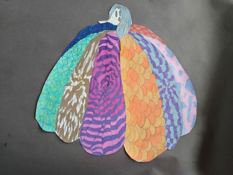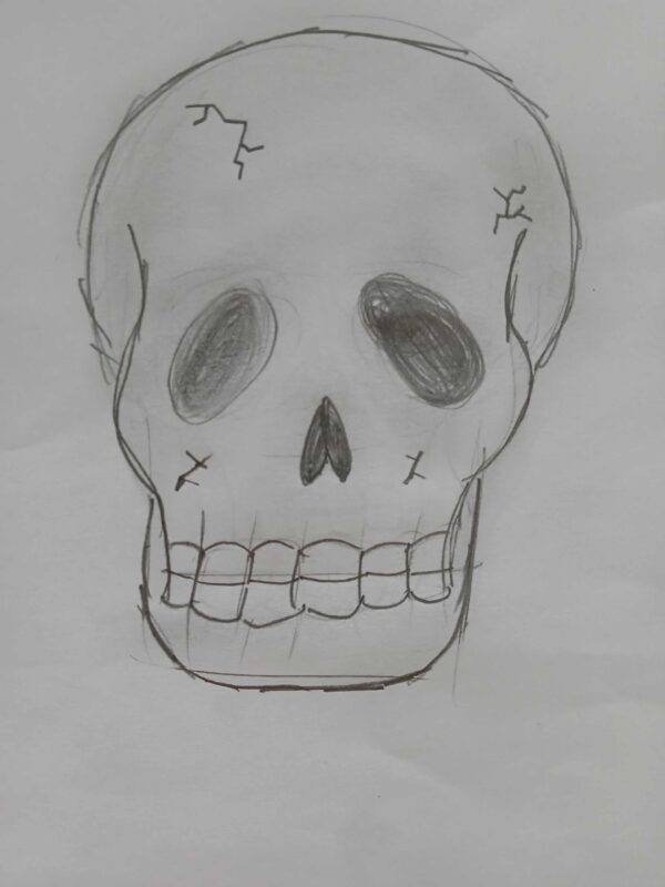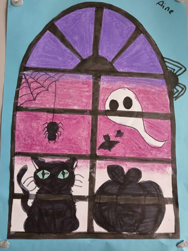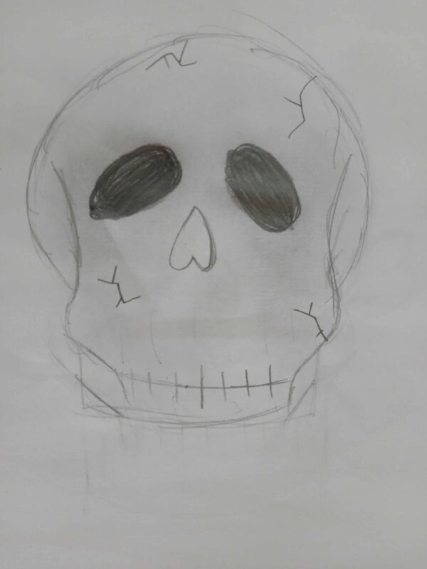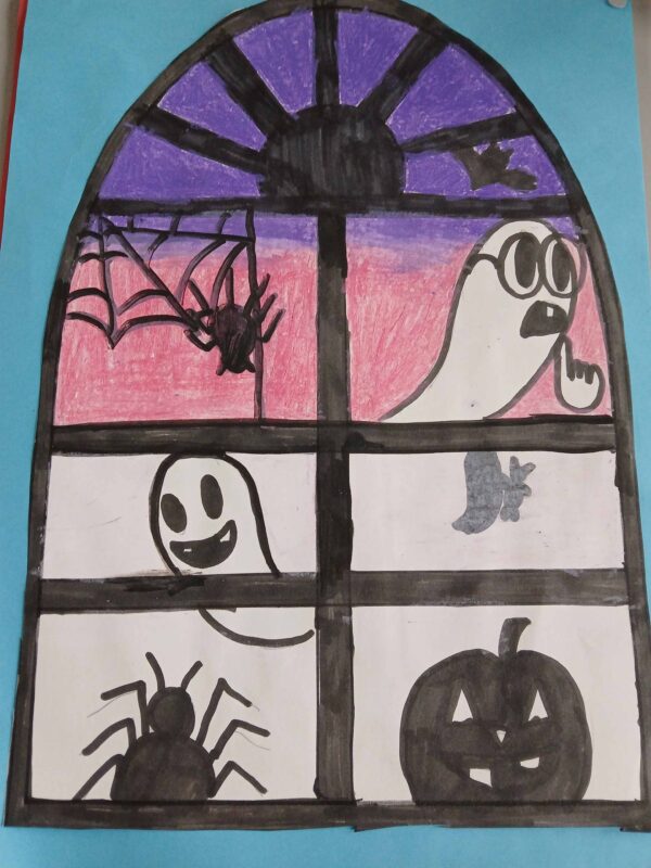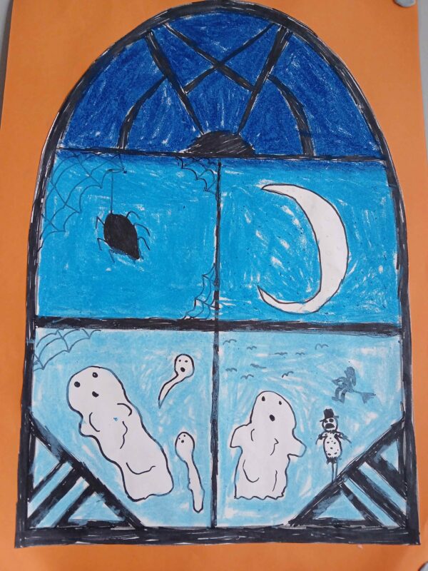 We explored working with oil pastels as a medium for drawing and colouring. Oil pastels are great for blending and shading and worked well on our spooky windows. We also looked at shape and shading through drawing Skeleton heads.